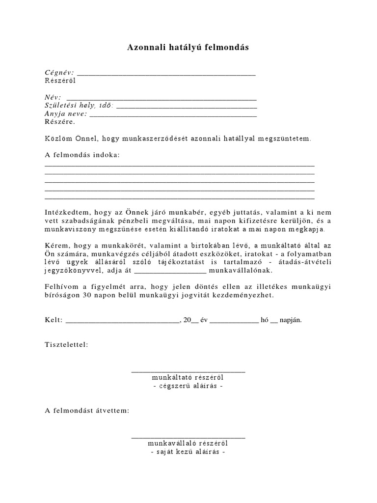 Azonnali Hatalyu Felmondas Minta Nyomtatvannyal Cvonline Hu