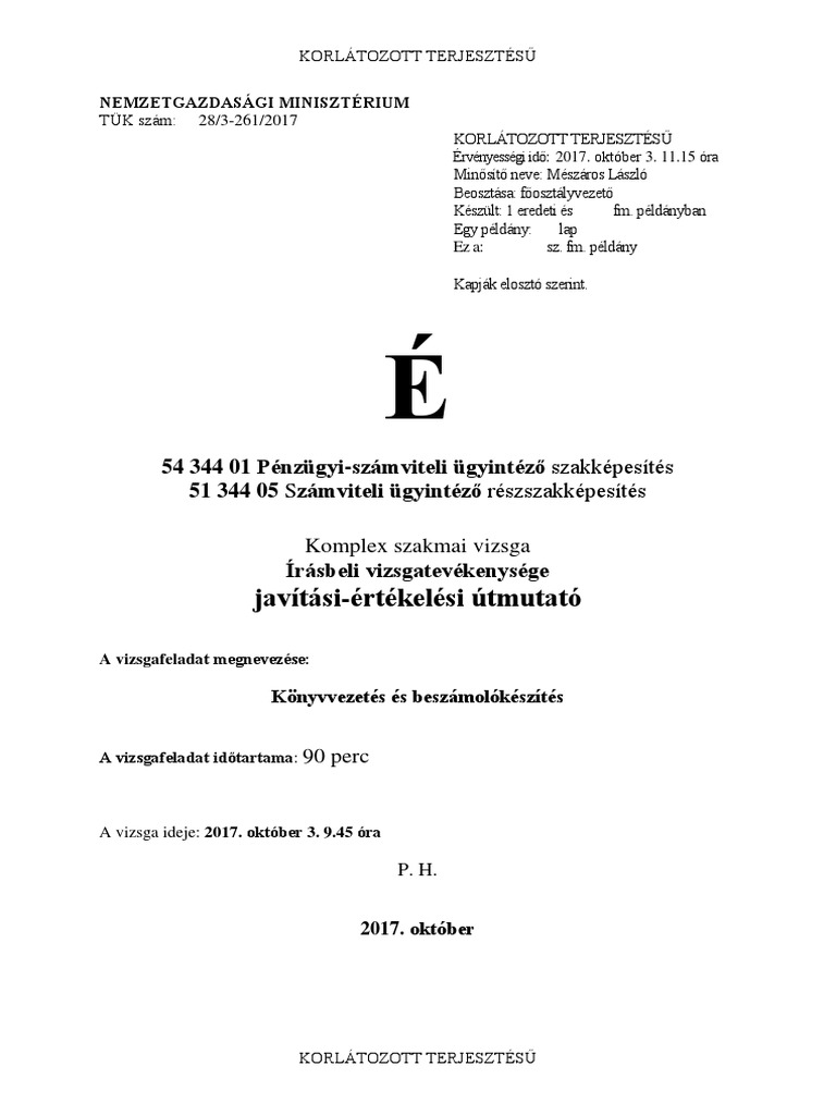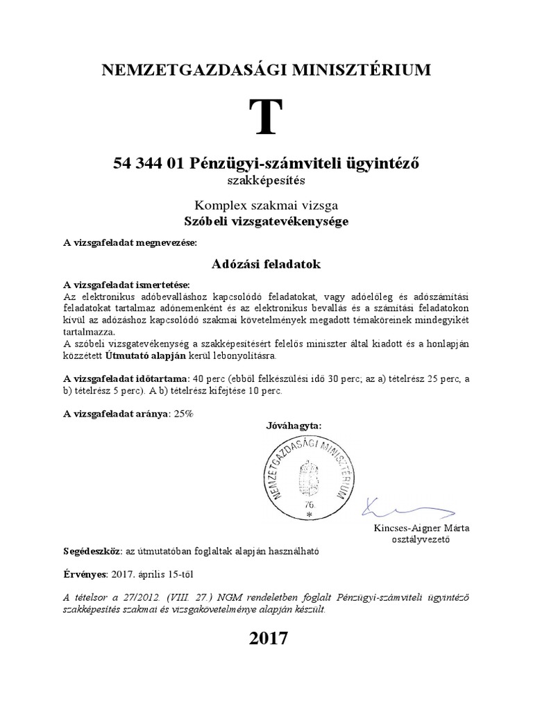 Nemzetgazdasagi Miniszterium Penzugyi Szamviteli Ugyintezo Szakkepesites Komplex Szakmai Vizsga Szobeli Vizsgatevekenysege Pdf Free Download